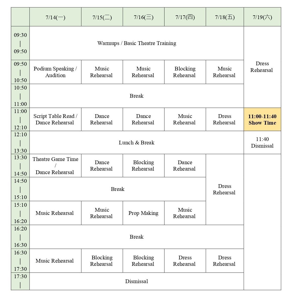 - Food: Lunch shall be provided each day of class (7/14-7/18) but not on the day of the final performance (7/19) as it ends at 11:40. Those with specific dietary requirements, such as vegetarian options or food allergies, must notify the event organizer during the fee payment process.