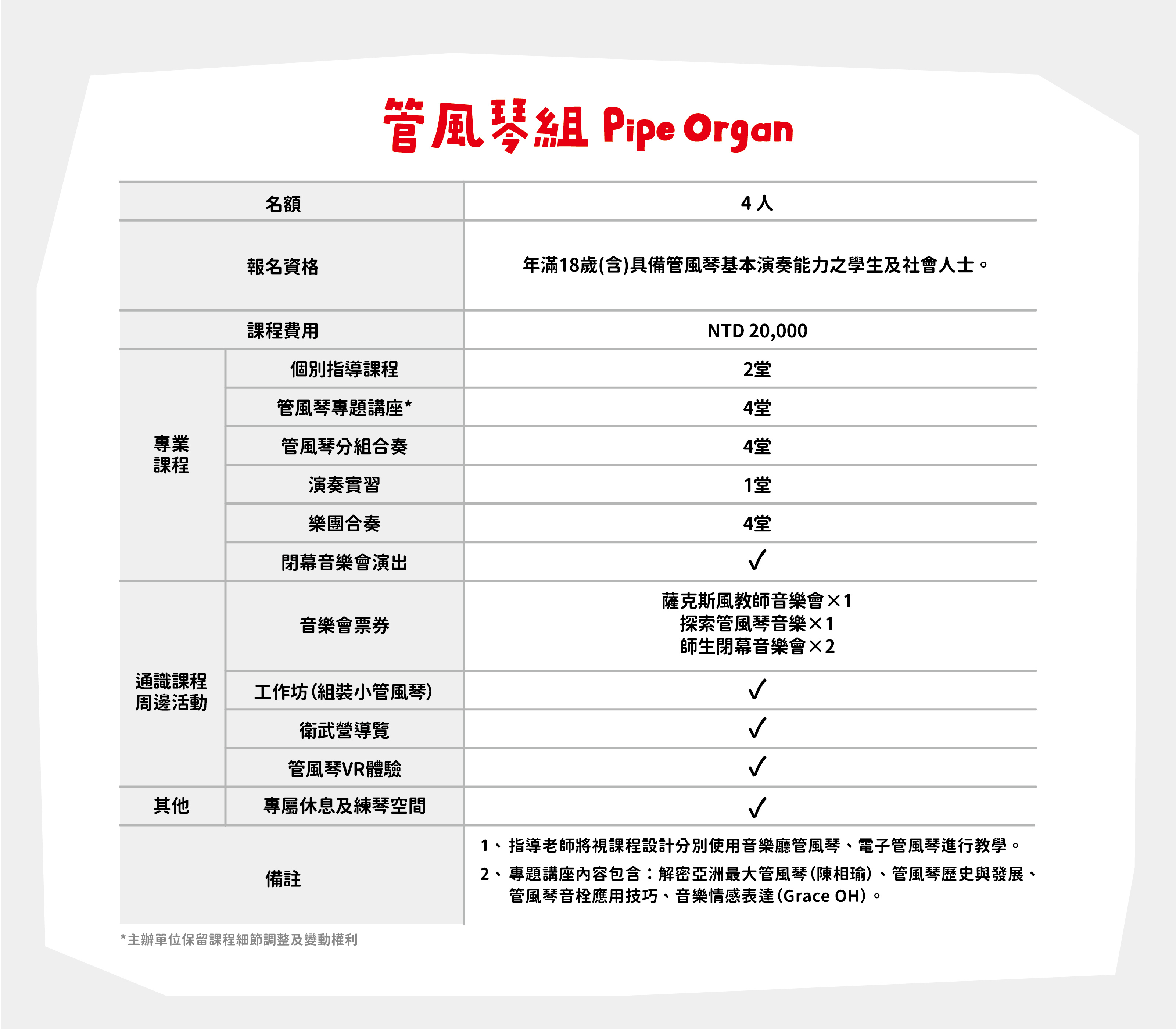 | 管風琴組 | 4名。年滿18歲(含)具備管風琴基本演奏能力之學生及社會人士。 | NTD 20,000 |