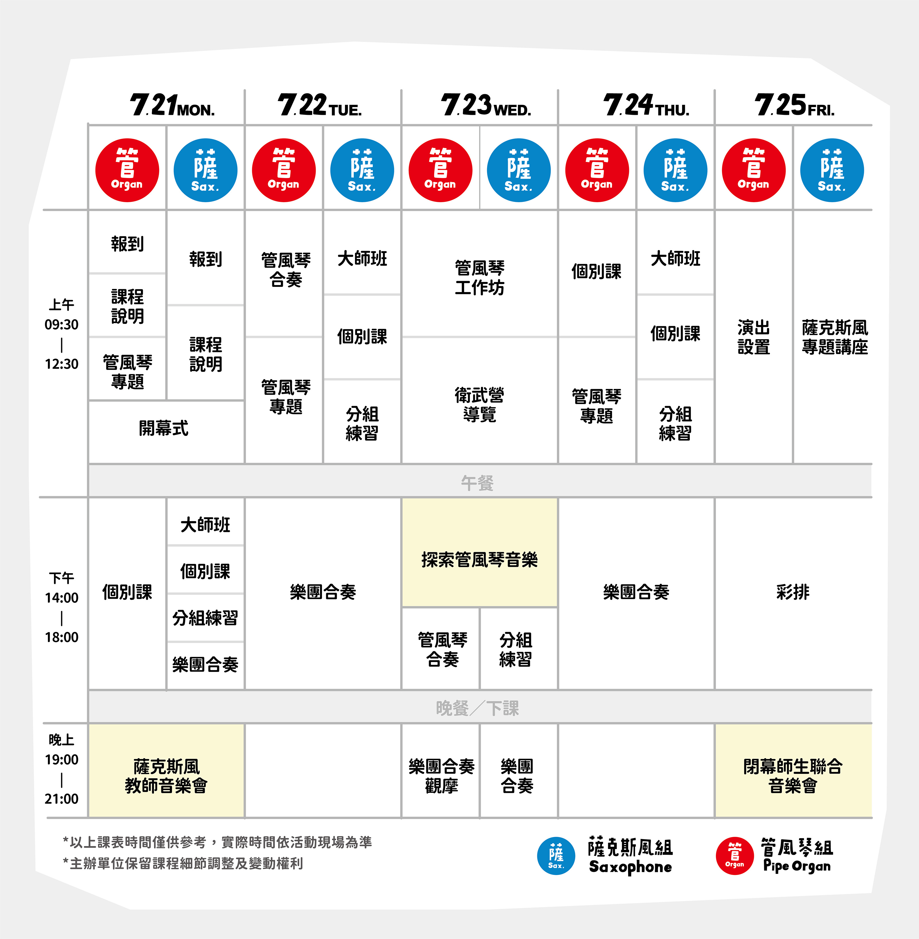 備註:費用包含個別課、大師班(薩克斯風-專業組)、分組課、樂團合奏/協奏、通識課程、閉幕師生聯合音樂會演出、演出票券(薩克斯風教師音樂會、探索管風琴音樂、閉幕師生聯合音樂會)、營隊期間餐食、保險;費用不含住宿,相關資訊請至上方「常見問題」分頁查看。