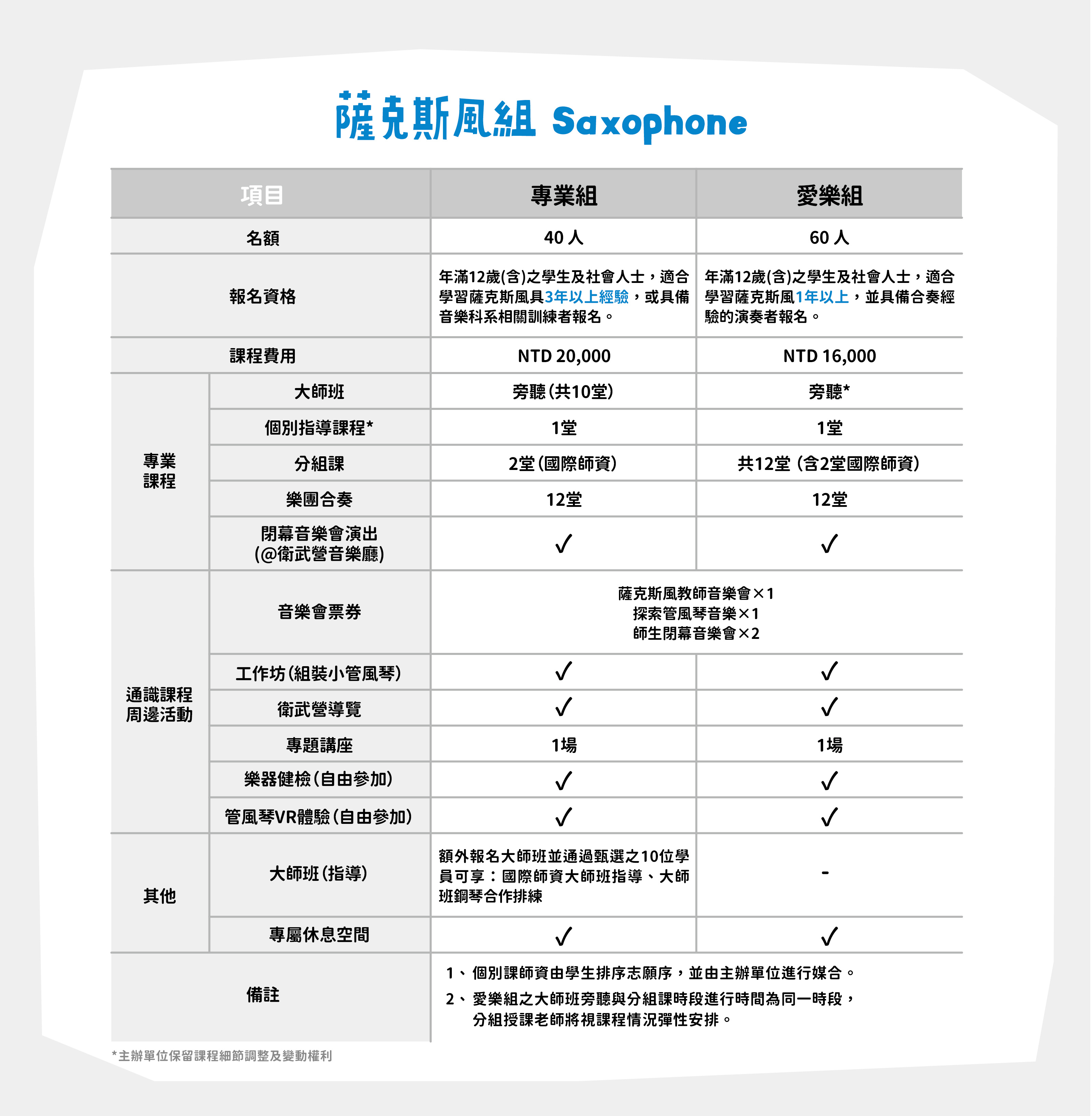 | 薩克斯風-專業組 | 40名。年滿12歲(含)具備薩克斯風基本演奏能力之學生及社會人士。適合學習薩克斯風具3年以上經驗,或具備音樂科系相關訓練者報名。 | NTD 20,000 |