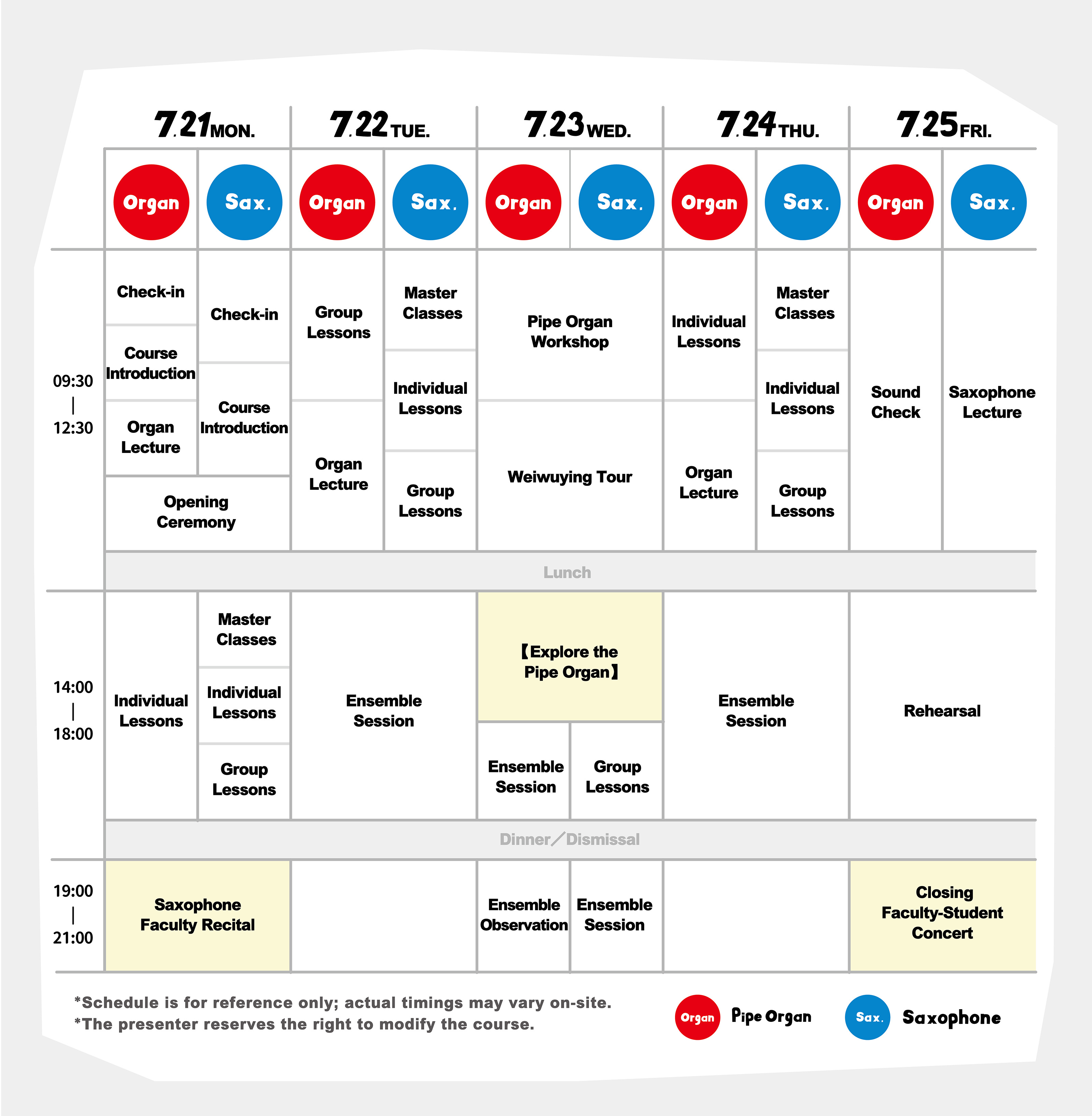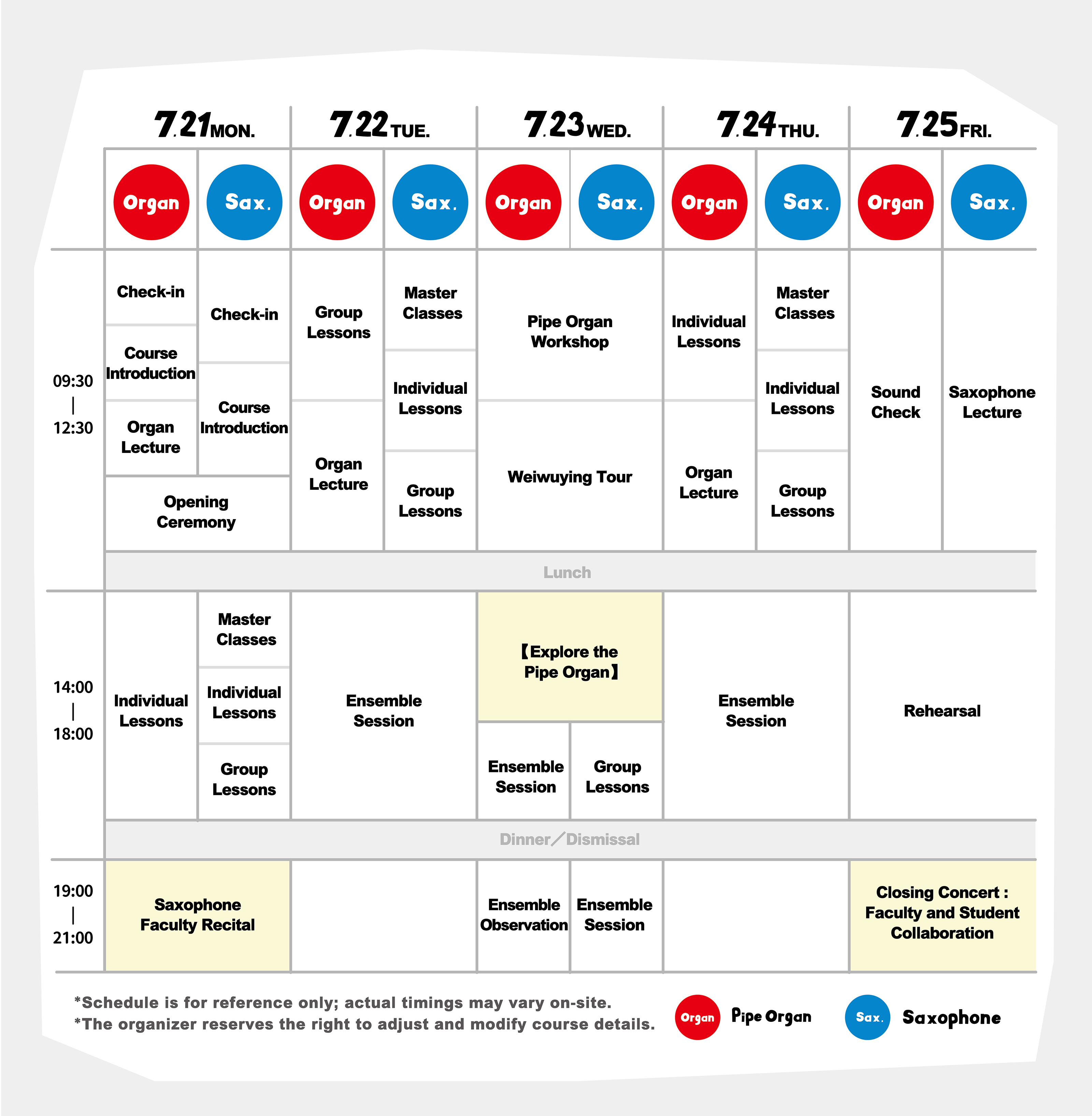 ♦ The fee covers individual lessons, masterclasses for saxophone, group lessons, ensemble sessions, general education courses, participation in the closing faculty-student concert, concert tickets (Saxophone Faculty Recital, 【Explore the Pipe Organ】,and Closing Faculty-Student Concert), and meals during the camp period. Accommodation is not included in the fee. For related information, please refer to the "F&Q" tab above.