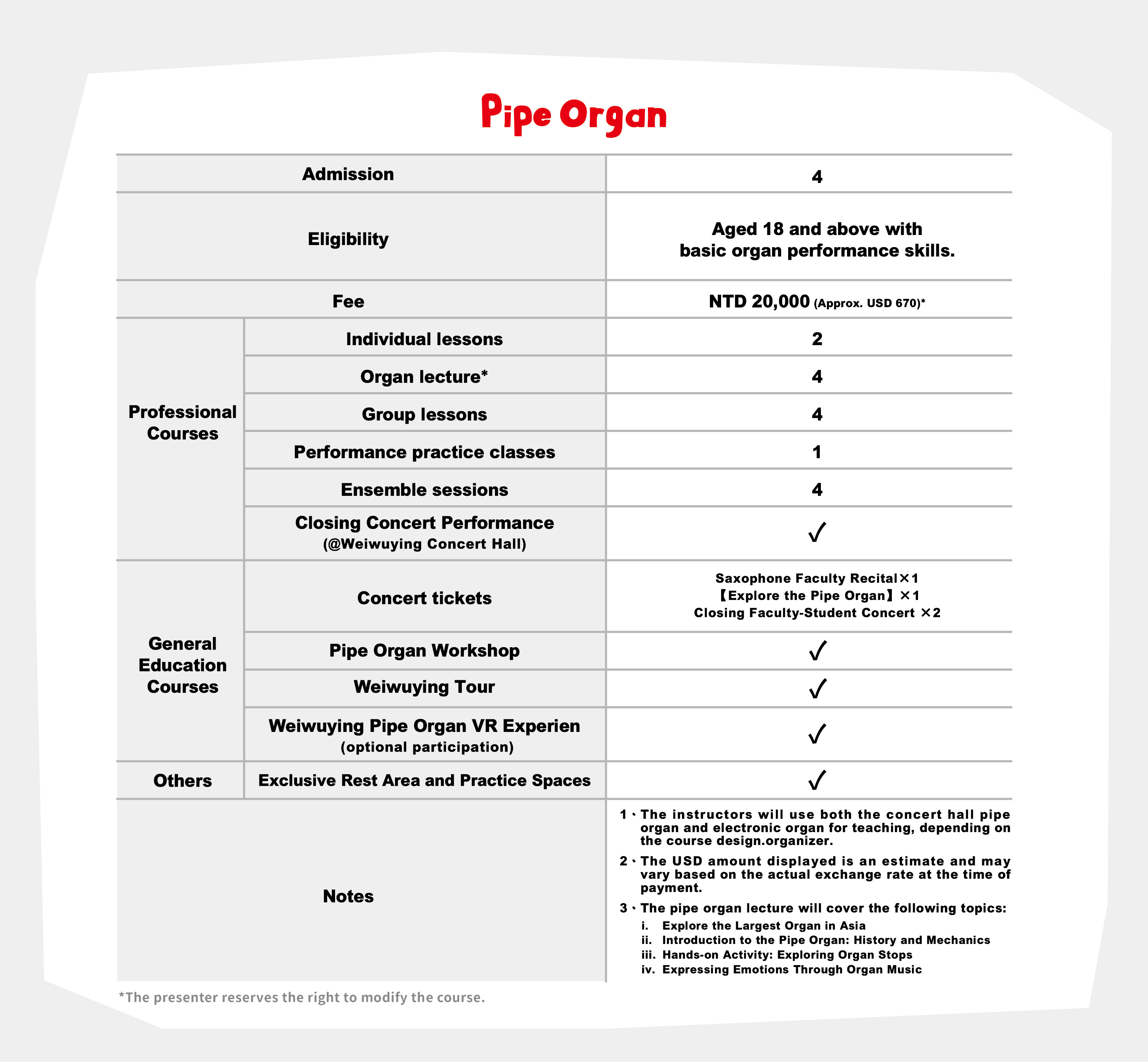 | Pipe Organ | Open to 4 participants, aged 18 and above with basic organ performance skills. | NTD 20,000 (Approx. USD 670) |