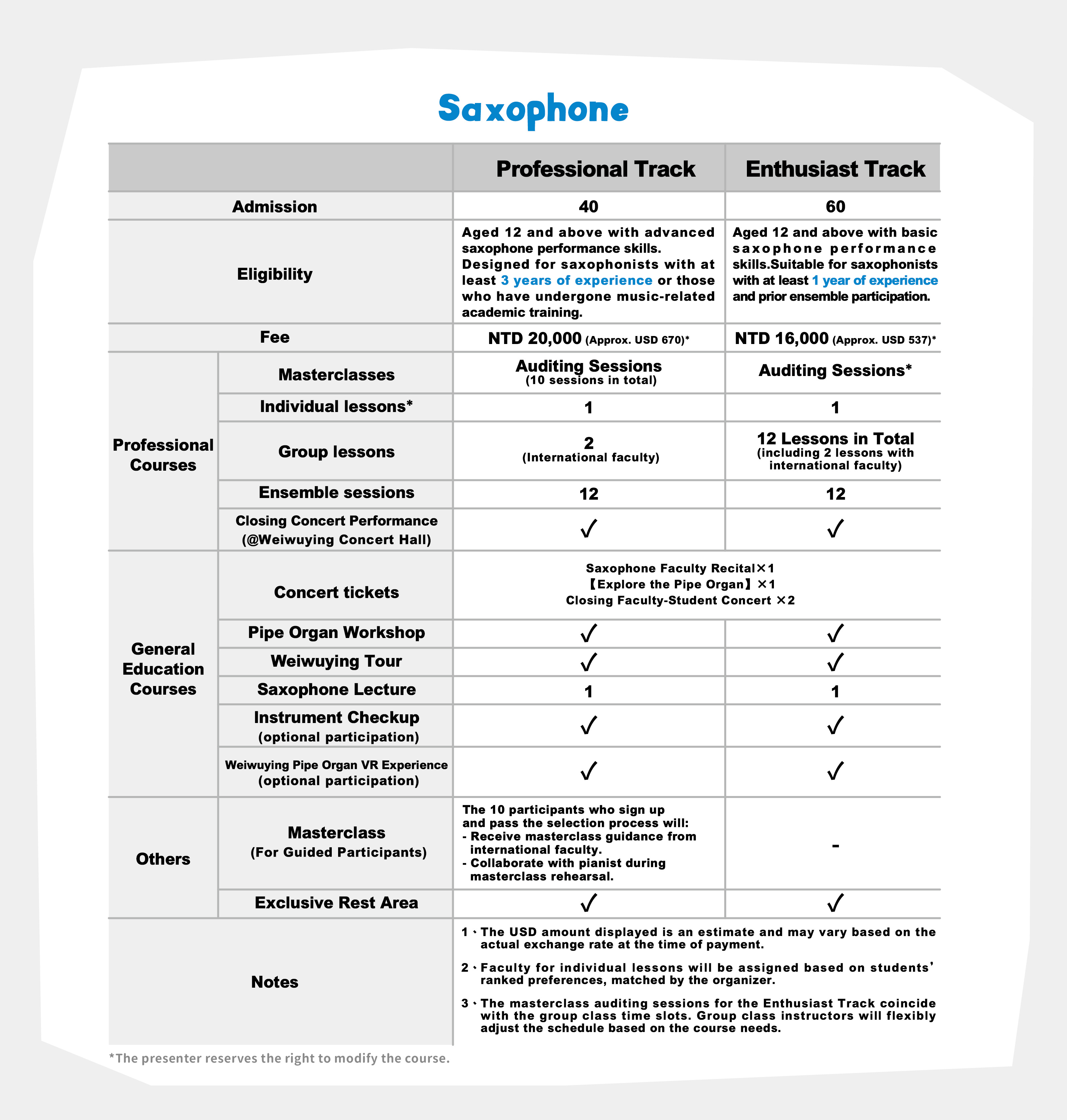 | Saxophone (Enthusiast Track) | Limited to 60 participants, aged 12 and above with basic saxophone performance skills. | NTD 16,000 (Approx. USD 537) |